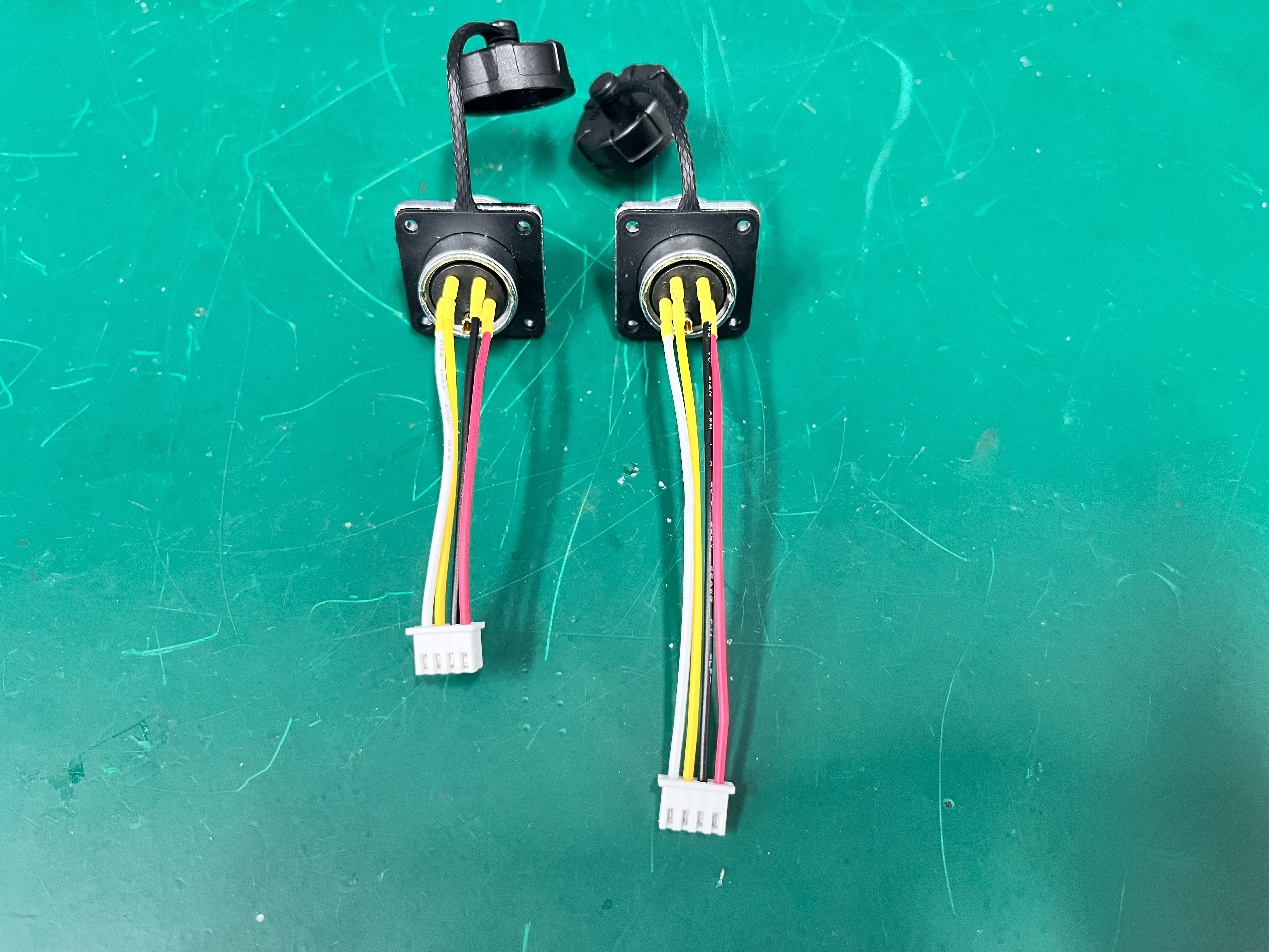- 两个航空插头延伸出的端子线交替插在电源转接板对应的四孔插座上,注意引脚名称都应为 +24V / A1 / B1 / GND